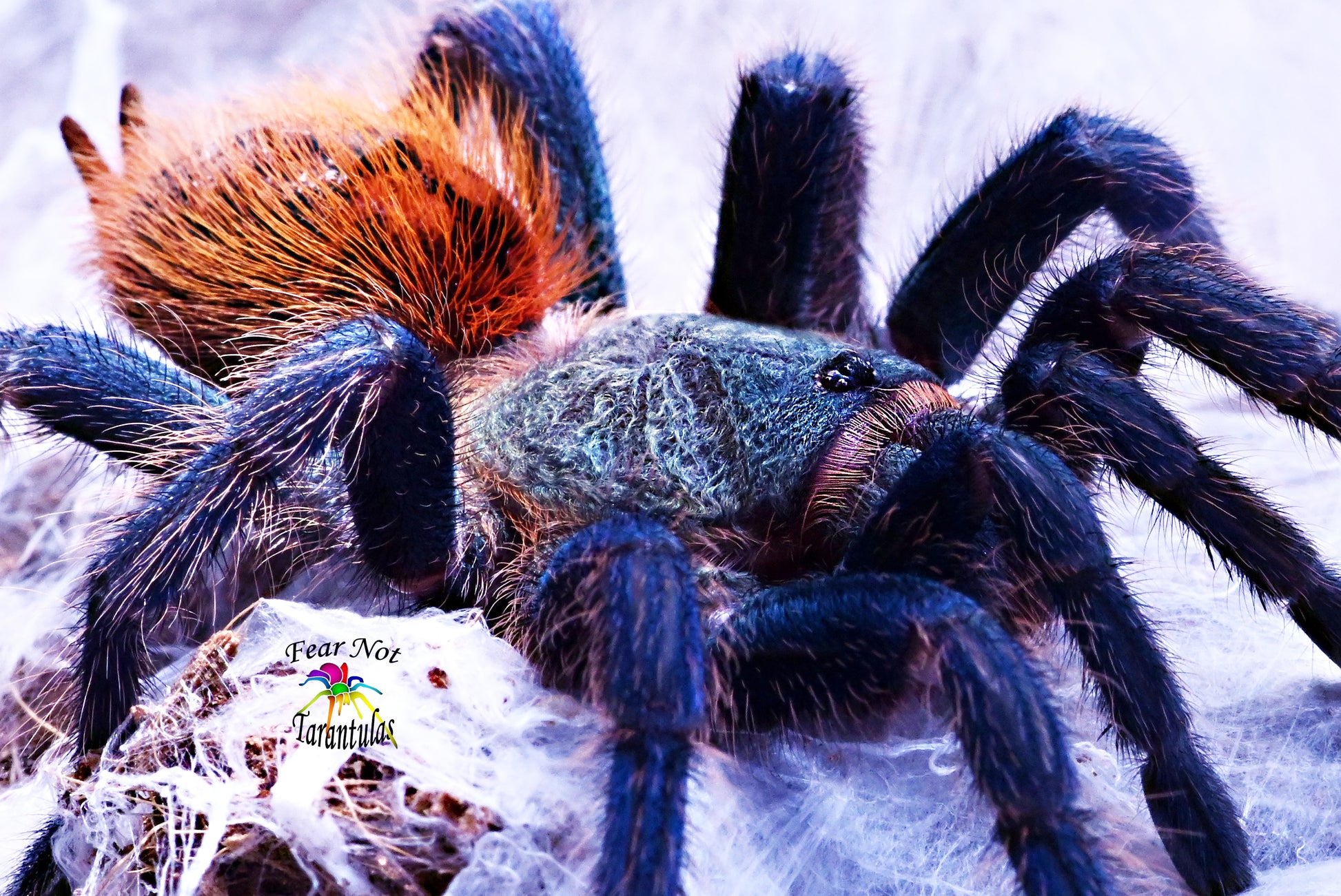 ย ๐๐ These are colorful eight-legged architects with an orange belly and blue metallic legs. They will excite you during dinner with their cat-like prey-drive. Of course, they are fan favorites, so easy to care for and raise. If you want a gorgeous eye-catching display tarantula that webs heavily and is fairly hands-off, this is one for you.ย ๐ธ๏ธ๐ธ๏ธ While itโs best to have a mostly terrestrial habitat, be sure to give your beautiful GBB anchor points to web and give you an eyeful of architectural artistry. This is a species that will appreciate a water dish and mostly dry substrate as adults. ๐๐ For the younger bunch, be sure to moisten a corner or deposit a few drops of water directly on their webbing to prevent dehydration. They also need plenty of ventilation to continue impressing you with their building skills! ๐ท๏ธ๐ท๏ธ