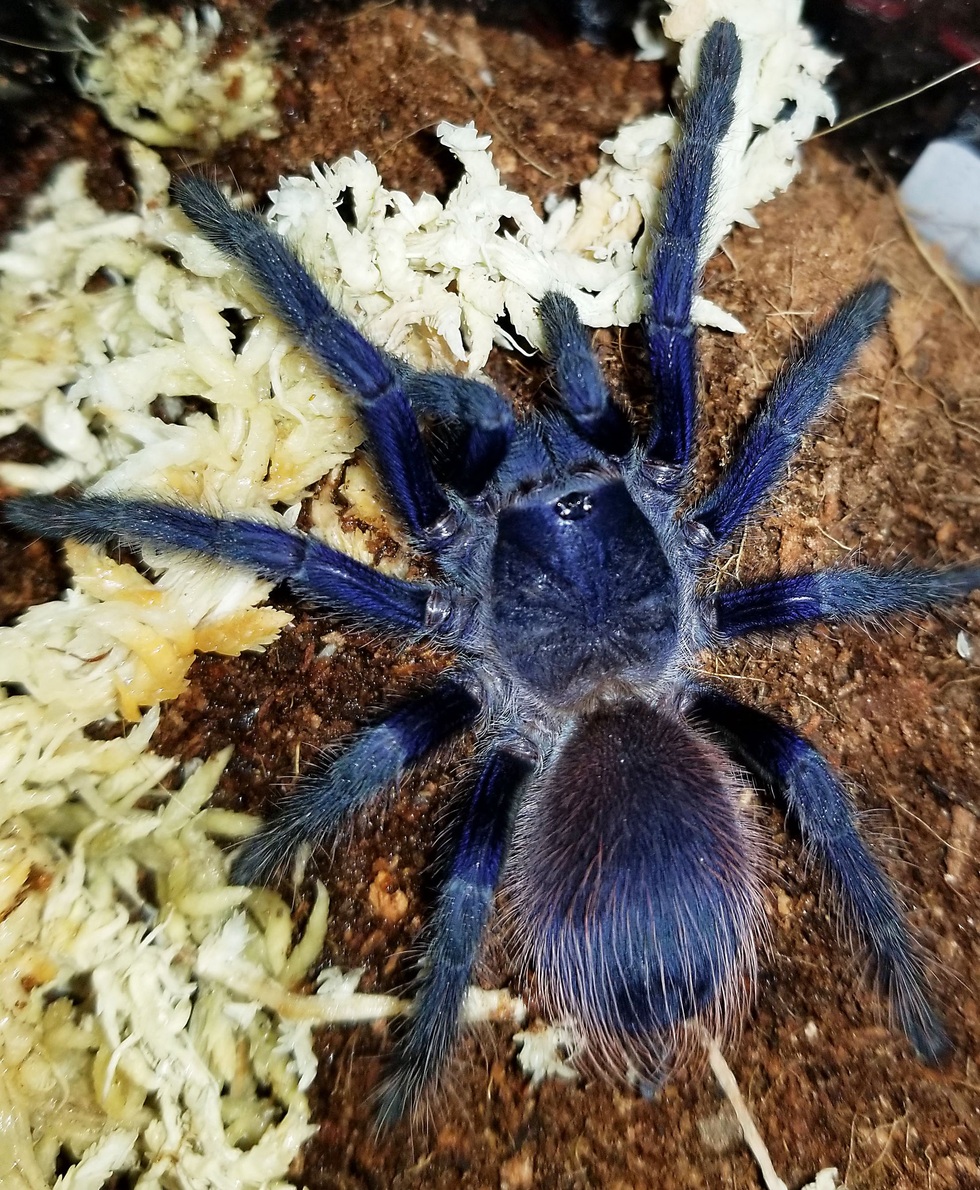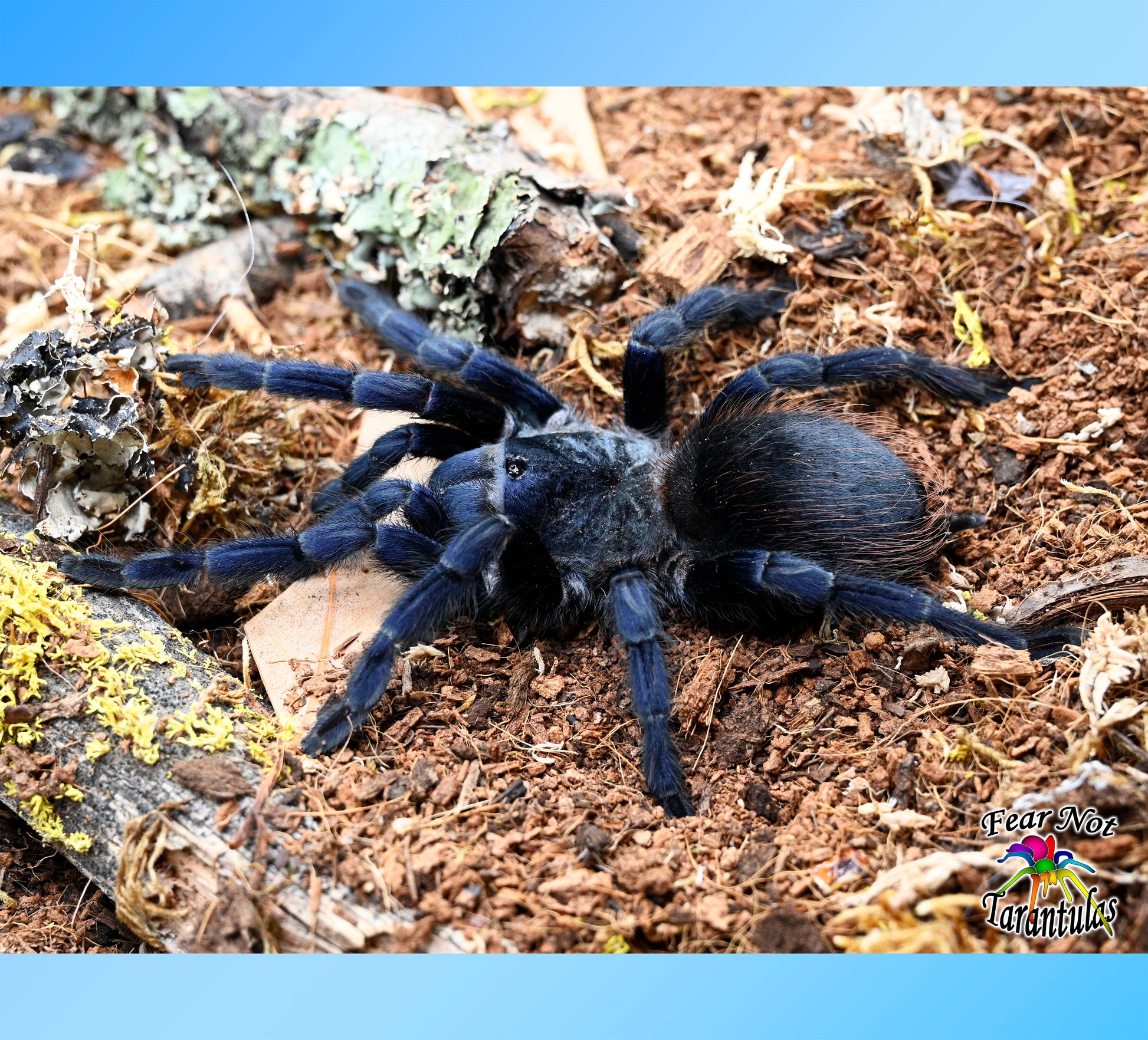 General info: The Pterinopelma sazimai tarantula is an impressive and highly sought after species for its striking indigo and blue tones. As a terrestrial Brazilian spider, they are perfect to add to any collection. With an adult body size of around 5-6", these beautiful spiders will surely make a statement!
